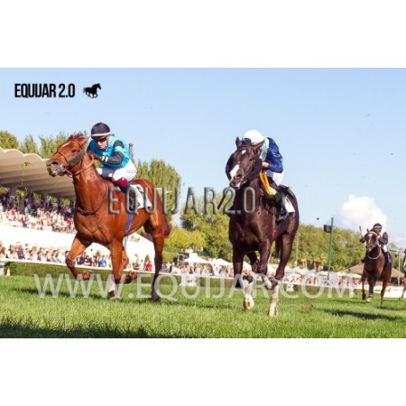 | P | Caballo | Peso | Jinete | Preparador | Propietario | Distancia | € | Div |