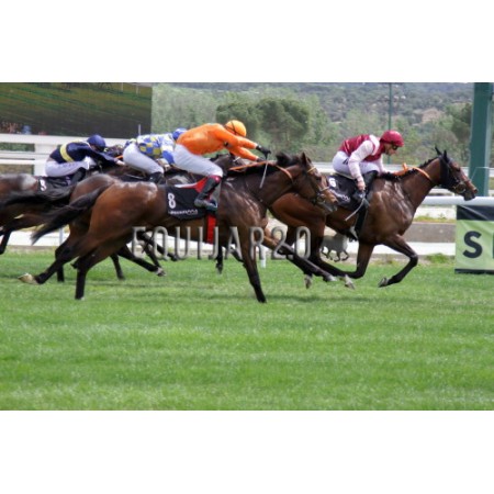 | P | Caballo | Peso | Jinete | Preparador | Propietario | Distancia | € | Div |