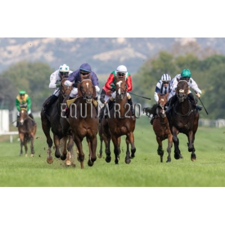 | P | Caballo | Peso | Jinete | Preparador | Propietario | Distancia | € | Div |