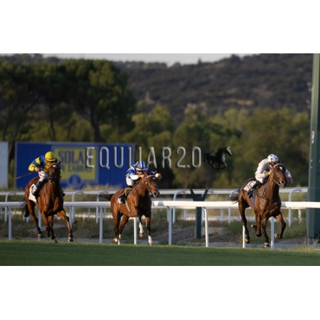 | P | Caballo | Peso | Jinete | Preparador | Propietario | Distancia | € | Div |