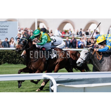 | P | Caballo | Peso | Jinete | Preparador | Propietario | Distancia | € | Div |
