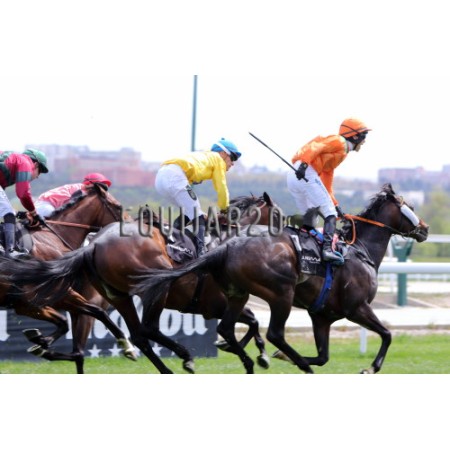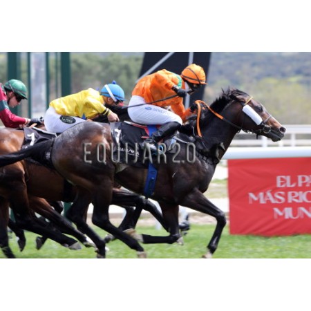 | P | Caballo | Peso | Jinete | Preparador | Propietario | Distancia | € | Div |