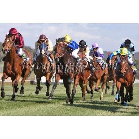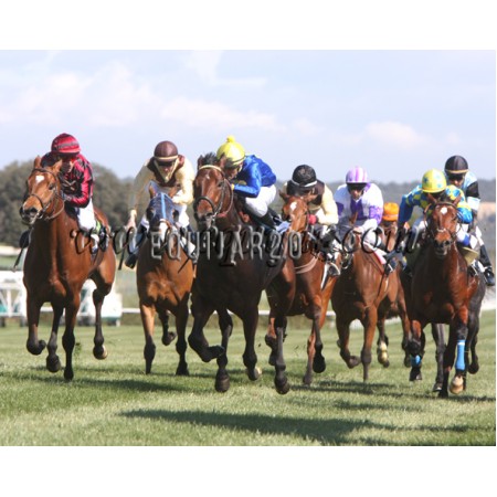 | P | Caballo | Peso | Jinete | Preparador | Propietario | Distancia | € | Div |