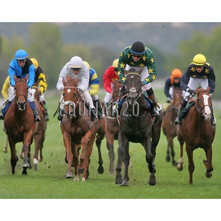 | P | Caballo | Peso | Jinete | Preparador | Propietario | Distancia | € | Div |