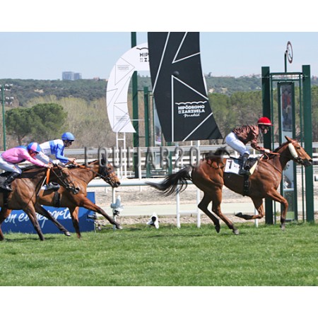 | P | Caballo | Peso | Jinete | Preparador | Propietario | Distancia | € | Div |