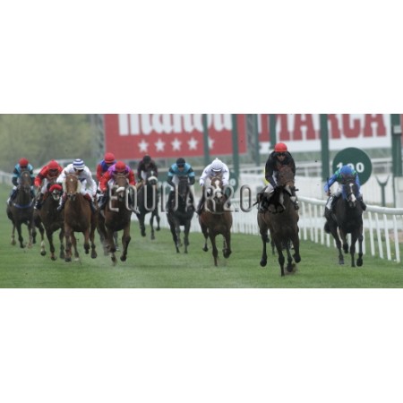 | P | Caballo | Peso | Jinete | Preparador | Propietario | Distancia | € | Div |