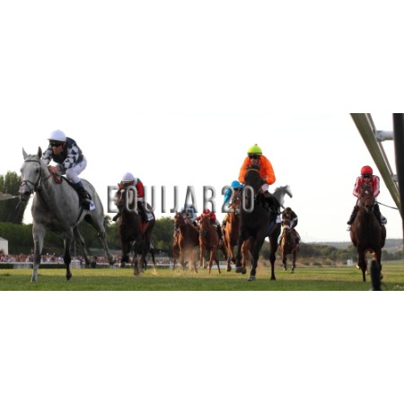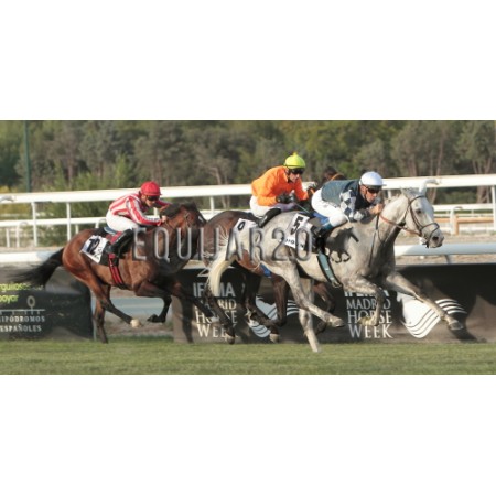| P | Caballo | Peso | Jinete | Preparador | Propietario | Distancia | € | Div |